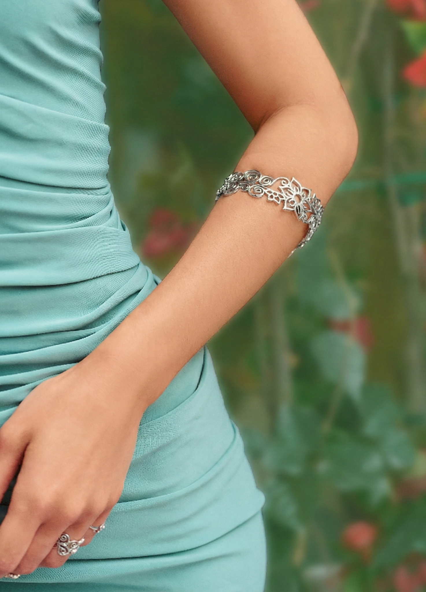 Modern flower child meets elevated festival fashion with Filienna's sterling silver Flower Arm Cuff. Wrap this statement filigree arm cuff around your upper arm or forearm to customize your look.