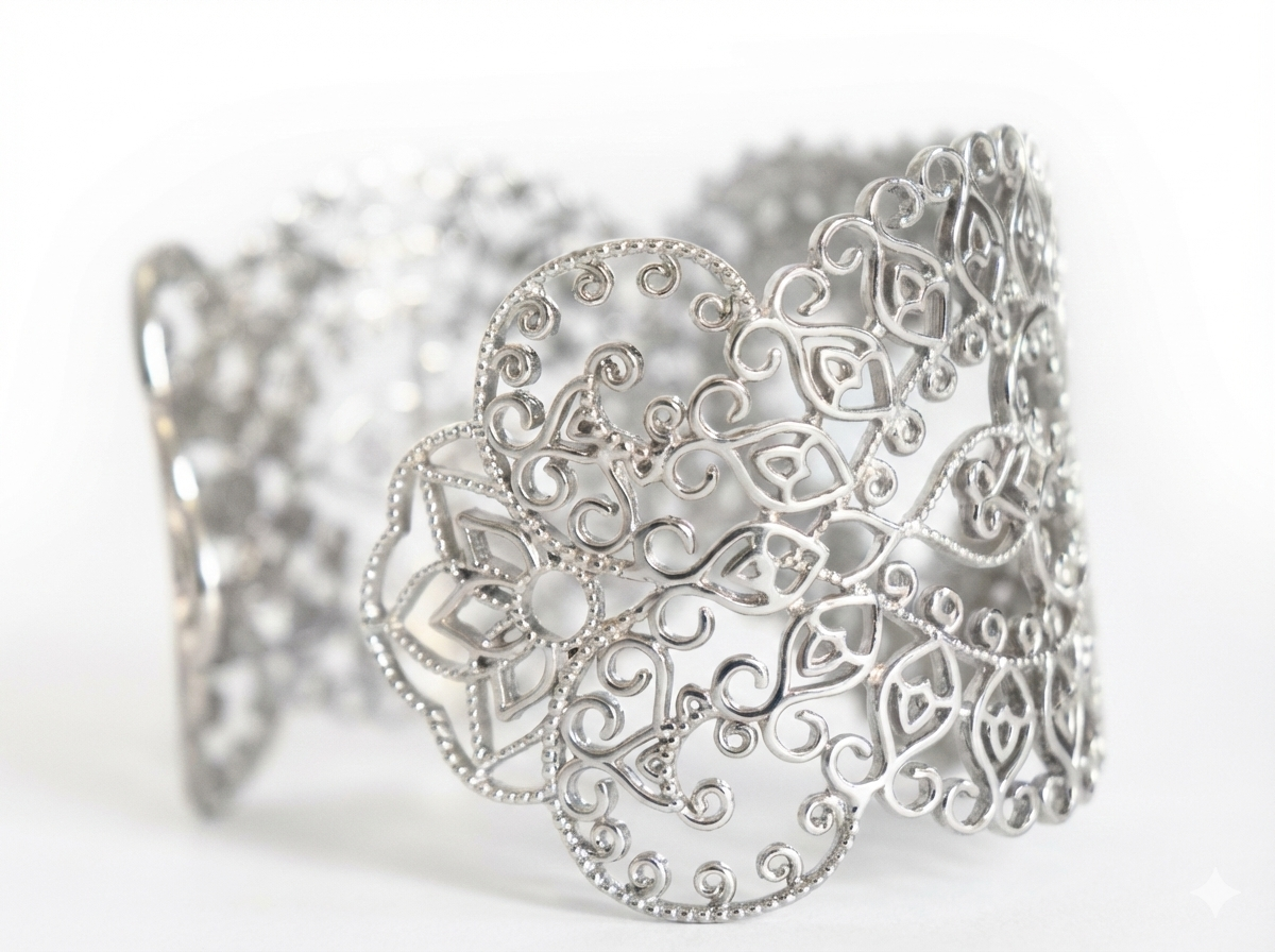 This striking, ornate Filienna cuff bracelet from the Heart Collection is crafted in 925 sterling silver, with rows of silvery filigree radiating out from its central openwork heart. An open cuff back makes this bold and chic filigree cuff bracelet easy to take on and off.